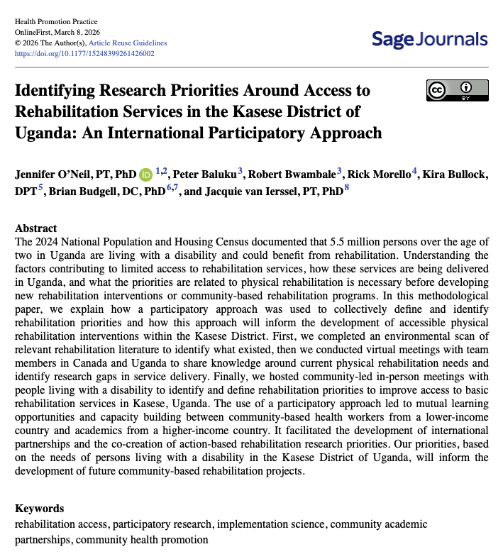 O’Neil J, Baluku P, Bwambale R, et al. Identifying Research Priorities Around Access to Rehabilitation Services in the Kasese District of Uganda: An International Participatory Approach. Health Promotion Practice. 2026;0(0). doi: 10.1177/15248399261426002